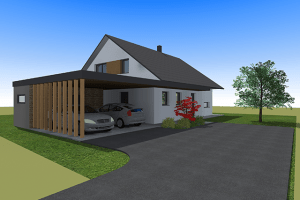 Poleg hiše je predviden tudi odprt nadstrešek za avte z manjšim zaprtim prostorom – lopo. Ta je postavljen v linijo hiše, tako da oba objekta skupaj optično zapirata in ločujeta zadnji servisni del parcele od vrtnega dela na južni strani.