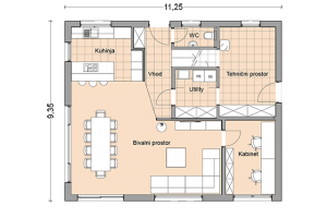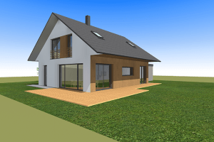 Orientacija nove hiše sledi prepoznavni liniji naselja, ki poteka v smeri JZ – SV. Glede na prostorsko umestitev in predvideno pasivno gradnjo so glavni bivalni prostori razporejeni na JV in JZ strani. Tu so umeščene tudi večje okenske odprtine in s tem optimalna izraba osončenja. Skladno s prostorskim aktom je hiša pokrita z dvokapno streho. Dvokapnica je glede na osnovni volumen nekoliko zamaknjena proti jugovzhodu, tako da dobimo na tej strani v poletnih mesecih naravno senčenje bivalnih prostorov.